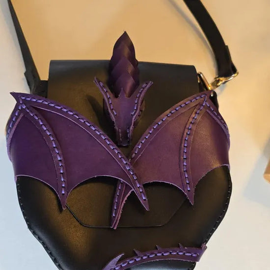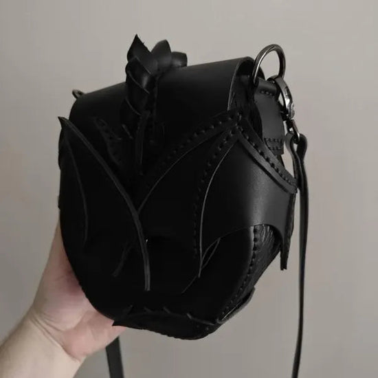 Premium leather construction with hand-stitched dragon wing detailing. Brass hardware. Adjustable shoulder strap. Magnetic snap closure. Fits phone, keys, wallet, and essentials. Compact enough to carry daily, detailed enough to turn heads. Every bag is inspected by me before it leaves the workshop.